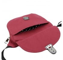 De hippocket heeft 2 vakken. Het grote vak heeft een rits in de kleur van de tas. De breedte van dit vak is 20 cm, de hoogte 18 cm en is ongeveer 3 cm diep. Het vak voorop heeft een klep met handige gesp sluiting en is 18 cm breed en 15 cm hoog. Bovenaan sluit het vak plat aan, maar de twee plooitjes onderaan geven net wat extra ruimte. Beide vakken hebben een voering van zwarte katoenmix met witte stipjes.