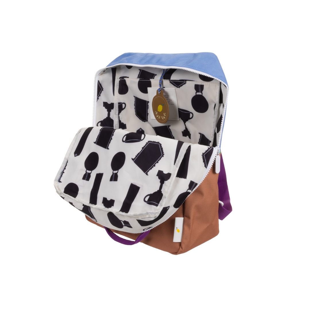 Het grote vak sluit met een YKK rits (met twee zippers) en de voering is extra leuk door de zwart-witte print. Het extra binnenvak, over de hele breedte, sluit met een klittenbandje, perfect voor je laptop of een map. Binnenin een elastiek om je drinkflesje goed op zijn plek te houden. Aan de voorkant 2 vakken die sluiten met een drukknoop. Let ook eens op het subtiele gestreepte randje, ook weer zo'n mooi detail.