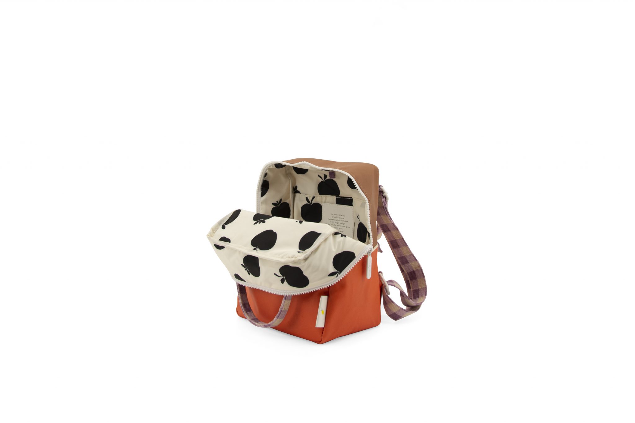De voering is waterdicht en heeft een zwart-wit appeltjes patroon. Aan de bovenzijde de stevige witte YKK rits (met twee zippers) zodat je de tas goed kunt afsluiten. Extra leuk detail zijn de verstelbare schouderbanden met ook leuke ruitjes print en in vrolijke kleur. Ook de buitenkant is waterbestendig.