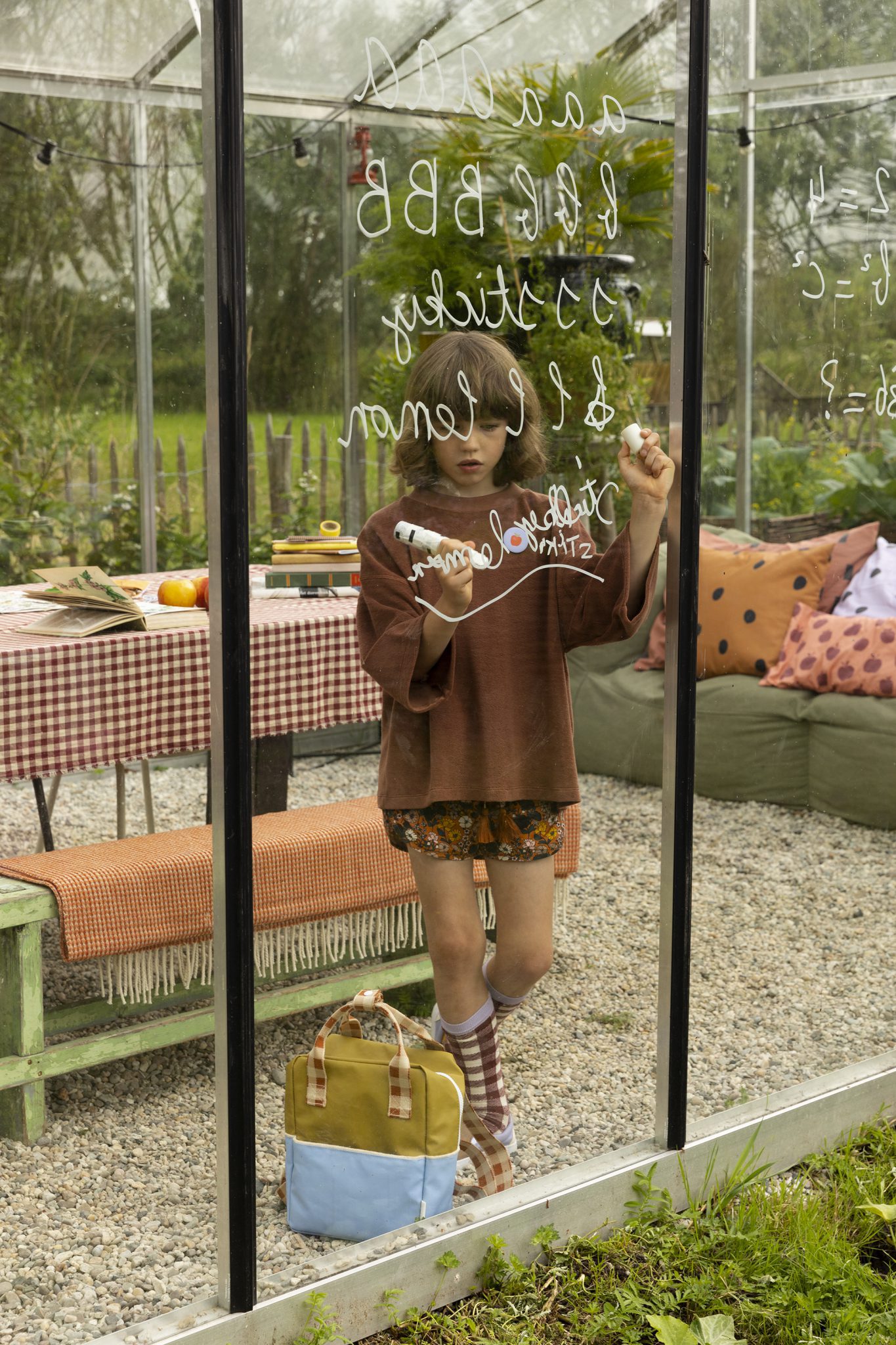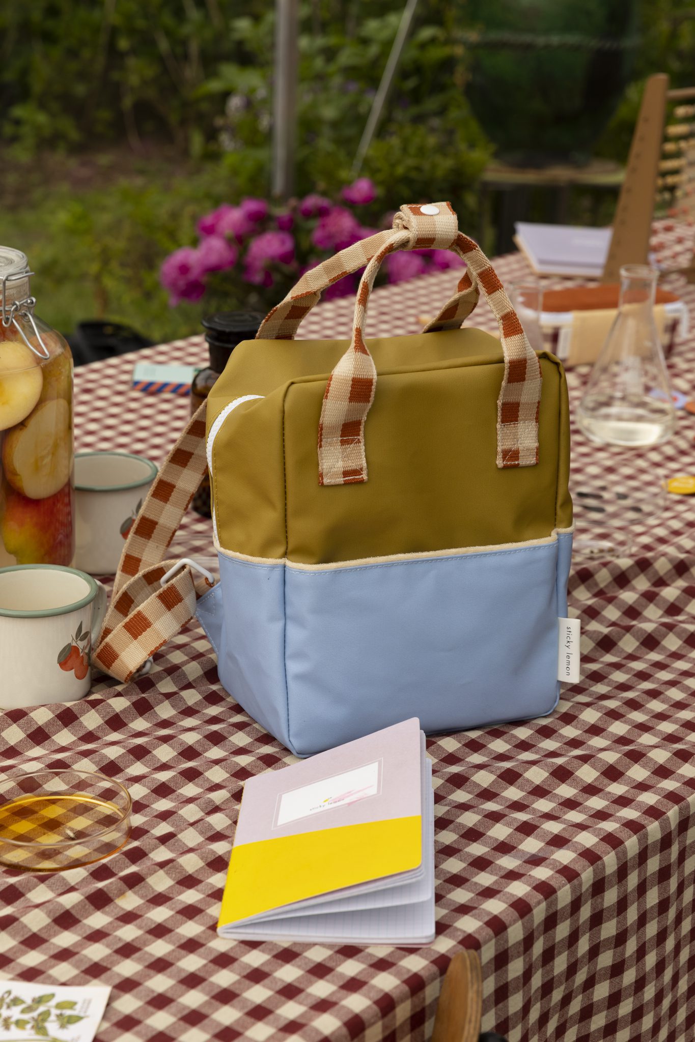 De voering is waterdicht en heeft een zwart-wit appeltjes patroon. Aan de bovenzijde de stevige witte YKK rits (met twee zippers) zodat je de tas goed kunt afsluiten. Extra leuk detail zijn de verstelbare schouderbanden met ook leuke ruitjes print en in vrolijke kleur. Ook de buitenkant is waterbestendig.