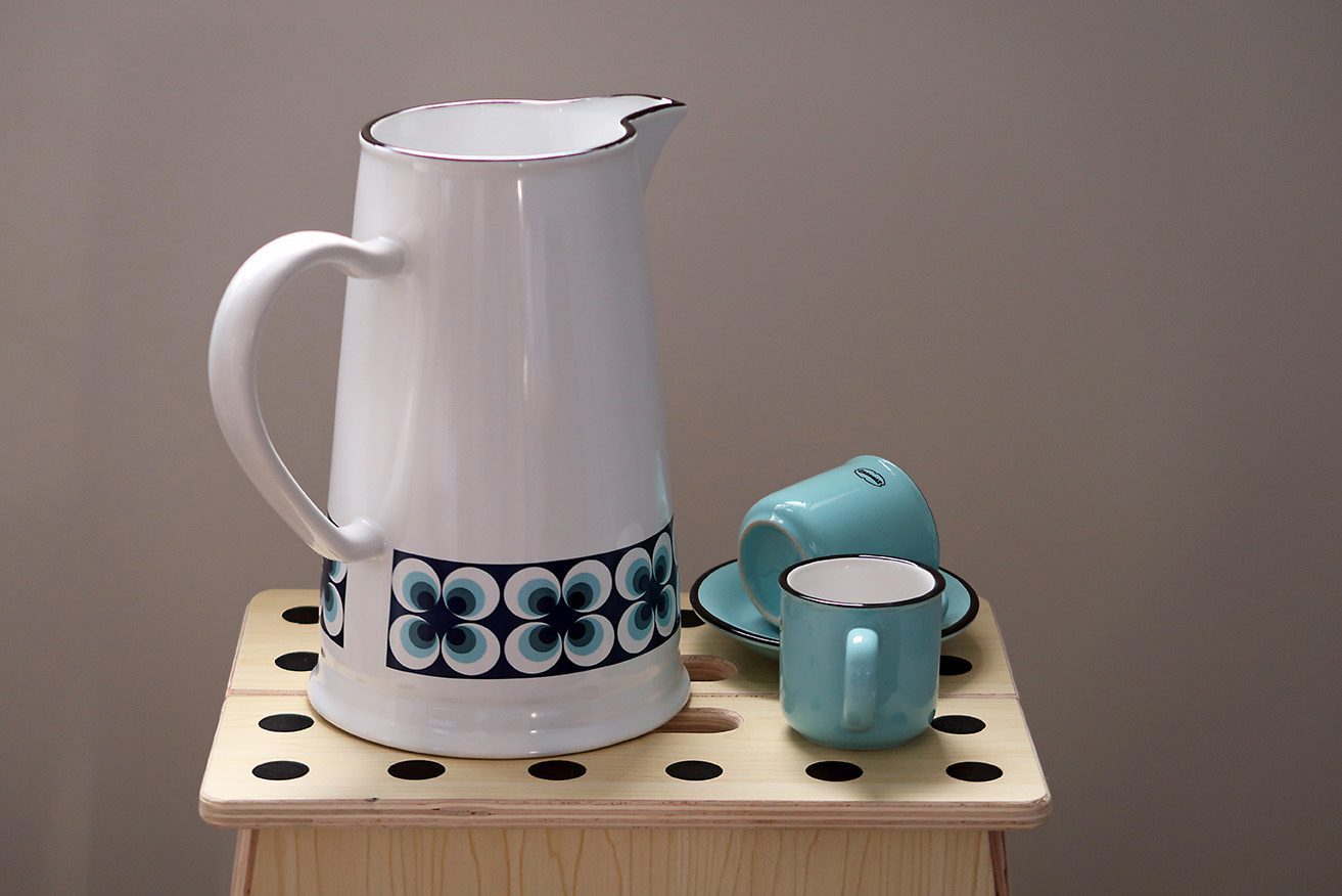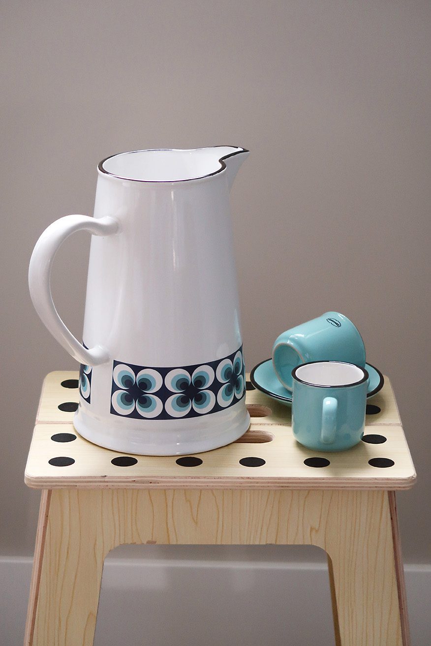 Schenkkan van keramiek met mooie retro print in het blauw. Ook te gebruiken als vaas. Inhoud 1,6 liter.