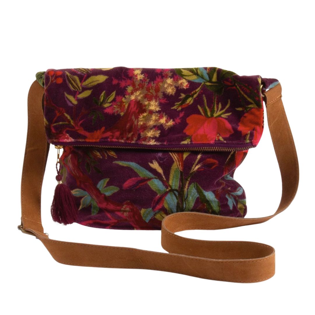 Kleurrijke tas van fluweel met paradise print. Draag als crossbody bag of schoudertas. Tas sluit met een rits en heeft verstelbare schouderband.