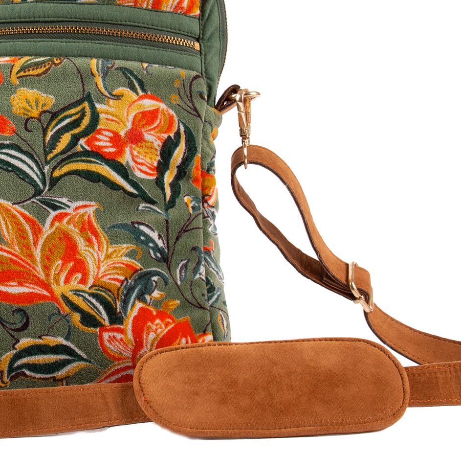 Ruime tas van fluweel met kleurrijke print. Draag als crossbody bag of schoudertas. Sluit met een rits, heeft verstelbare schouderband en verschillende vakken.