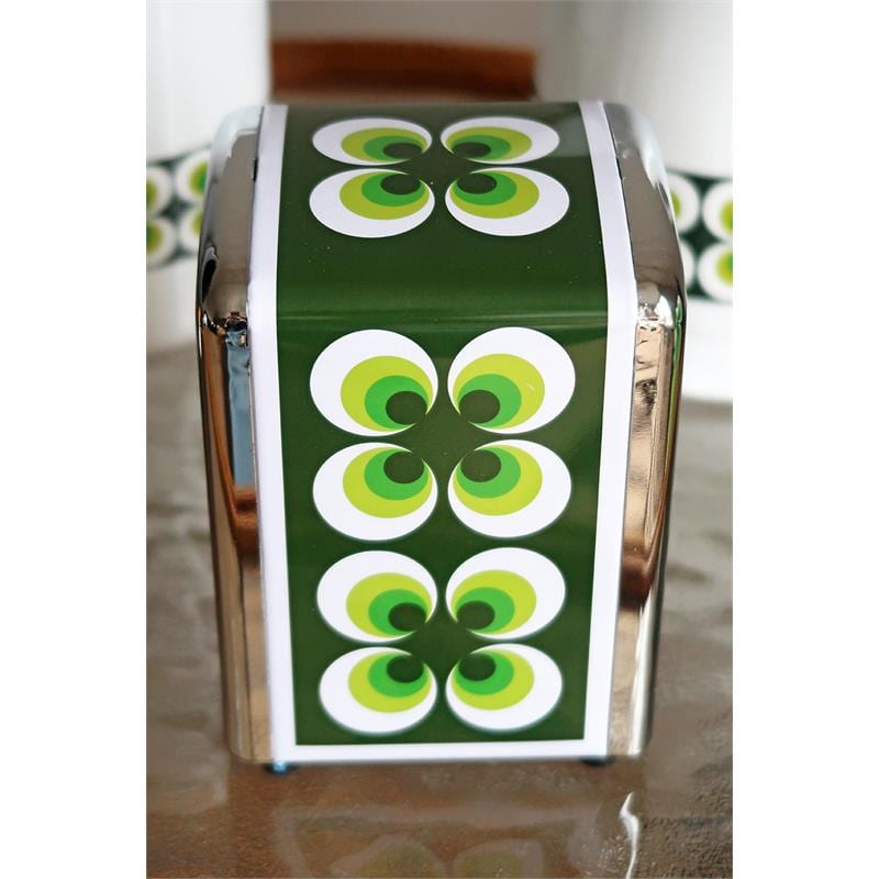Die vieze vingers zijn nu geen probleem meer! Deze originele retro Cabanaz servettenhouder - ramona groen - is altijd binnen handbereik. Met deze vrolijke retro print neemt de serie Ramona van Cabanaz jou mee terug naar de Seventies. Geef eenvoudig je woonkamer of keuken met deze retro accessoires dit vleugje nostalgie en breng zo de jaren '70 terug in je interieur.