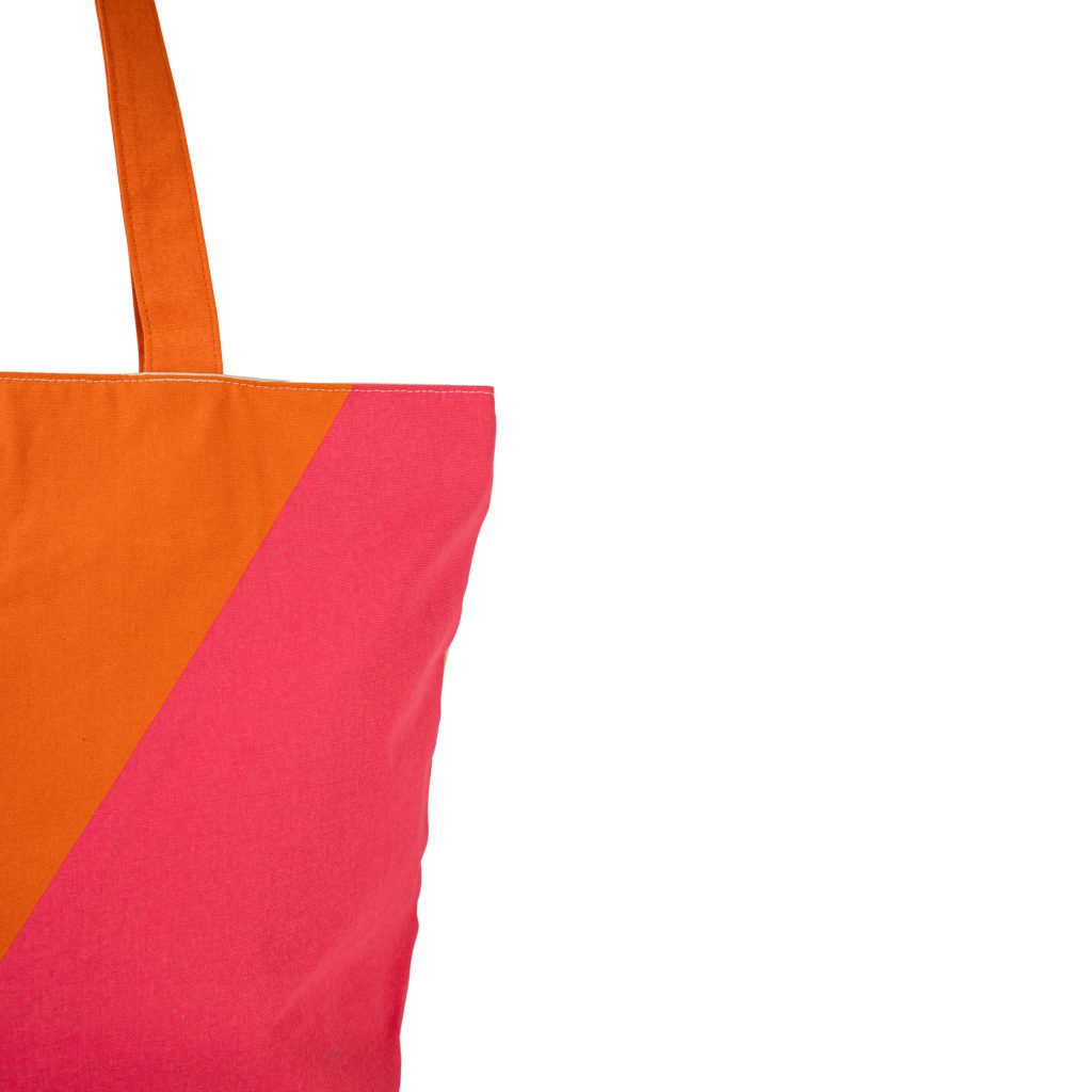 De tas heeft aan de buitenkant drie verschillende vlakken in oranje, roze en ecru. De binnenkant van de shopper is gevoerd met ecru katoen en heeft afsluitbaar binnenvak (met rits). Zo kun jij je sleutels, portemonnee en telefoon veilig opbergen. Ook het hoofdvak sluit met een rits. De hengsels zijn perfect van lengte, zodat je de tas zowel aan de hand als over je schouder kunt dragen. Je kunt de shopper ook uitstekend gebruiken als strandtas of tas voor een weekendje weg. De sleutelring aan de binnenkant, die kun je gebruiken voor bijvoorbeeld jouw sleutels of winkelwagenmuntje. Met deze hippe shoppers heb jij geen plastic tasjes meer nodig! Bekijk de foto's voor de mooie details.