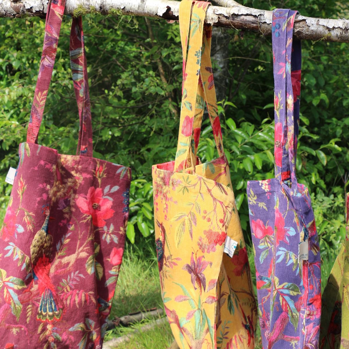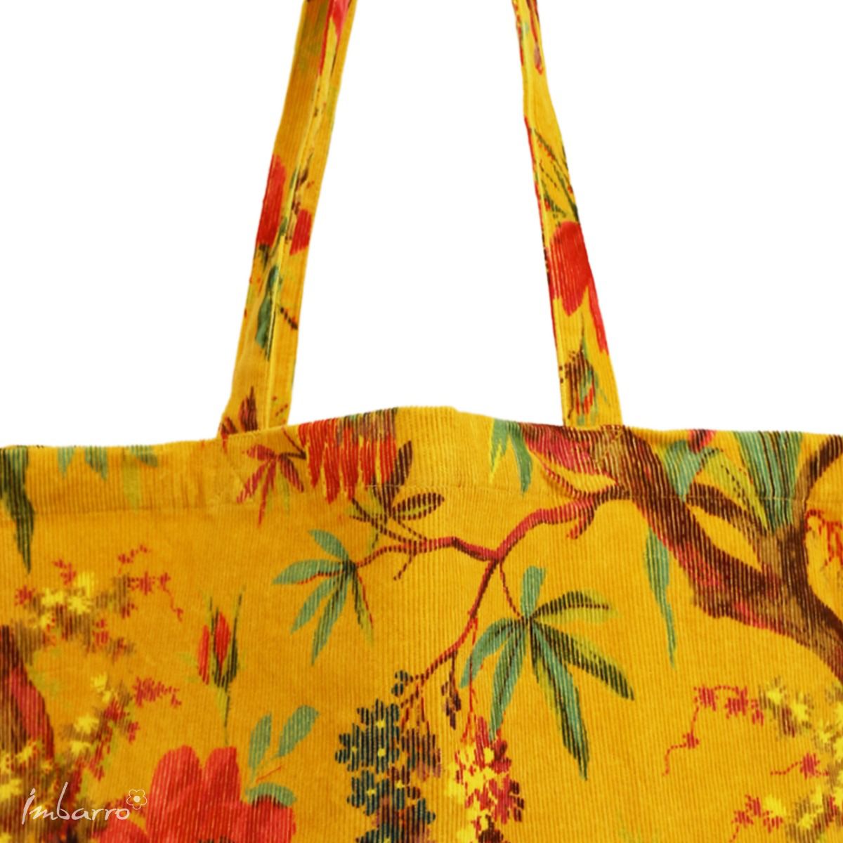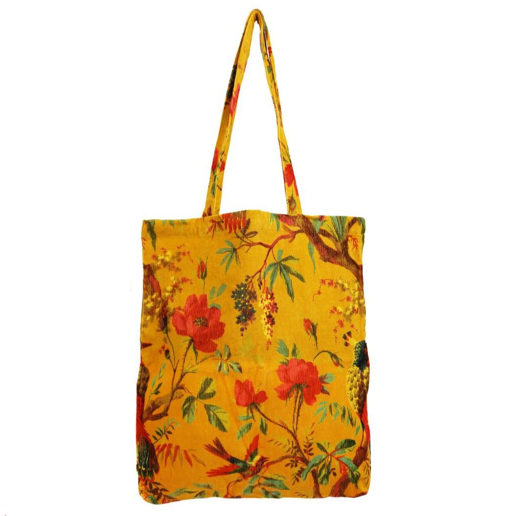 Stoere en elegante shopper met verrassende look. De tas is gemaakt van trendy corduroy met de kleurrijke en exotische Paradise print. Een hele leuke en handige tas die je overal mee naar toe neemt. Makkelijk om op te vouwen! De tas is met de hand bedrukt met bloemen en vogels in prachtige kleuren.
