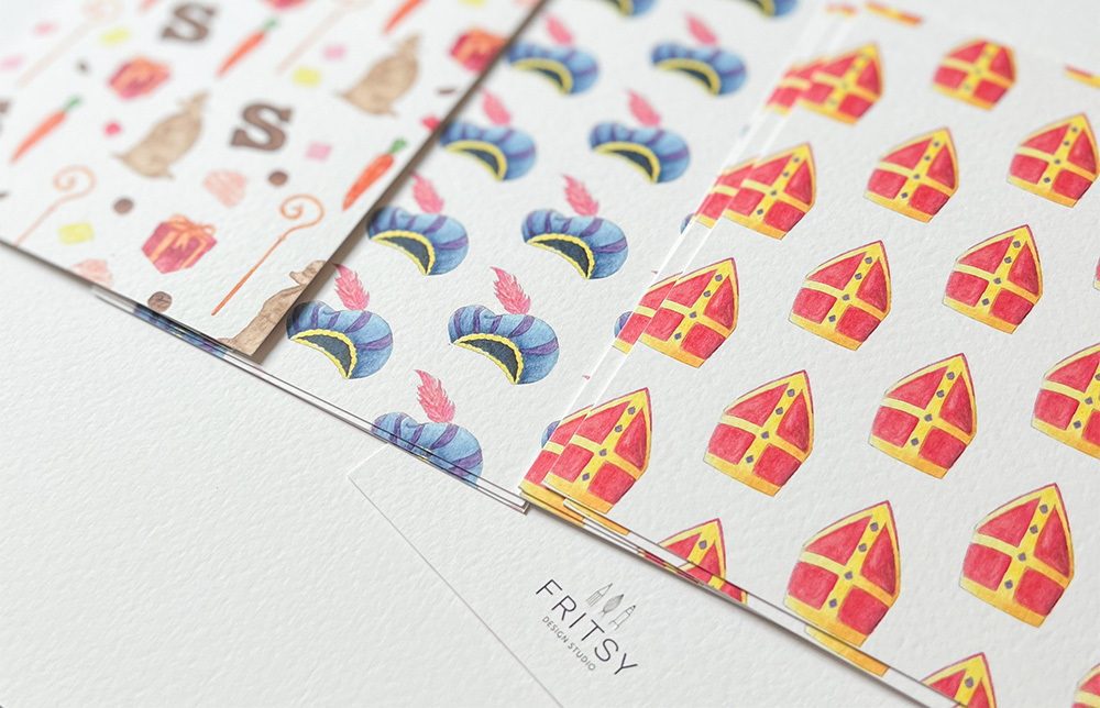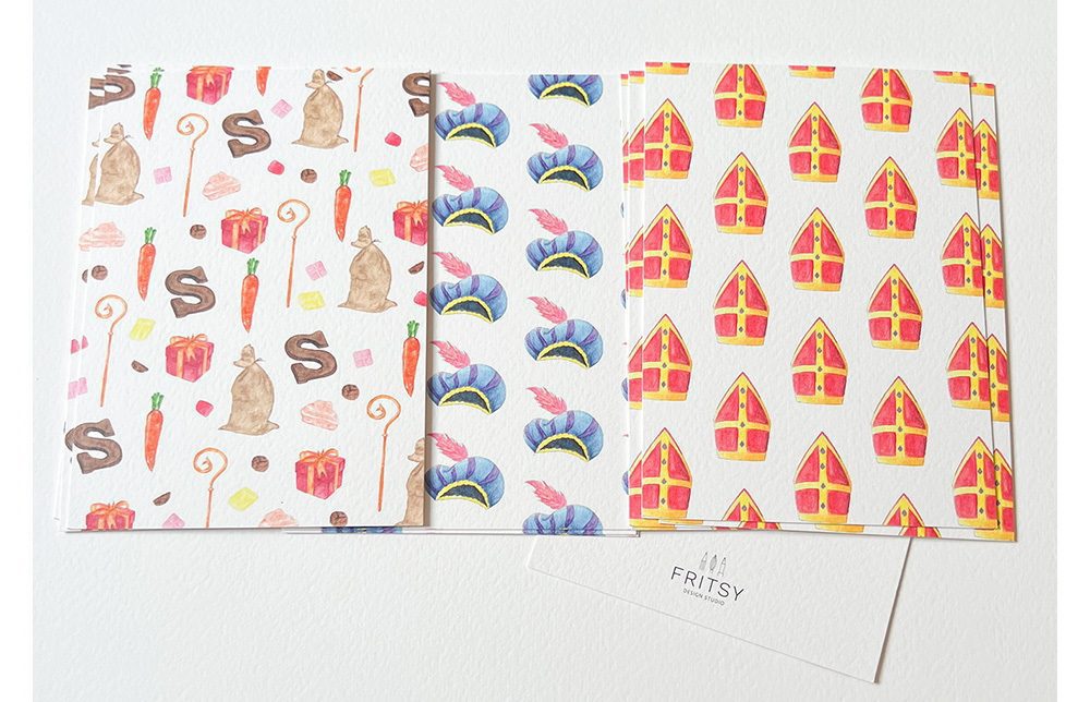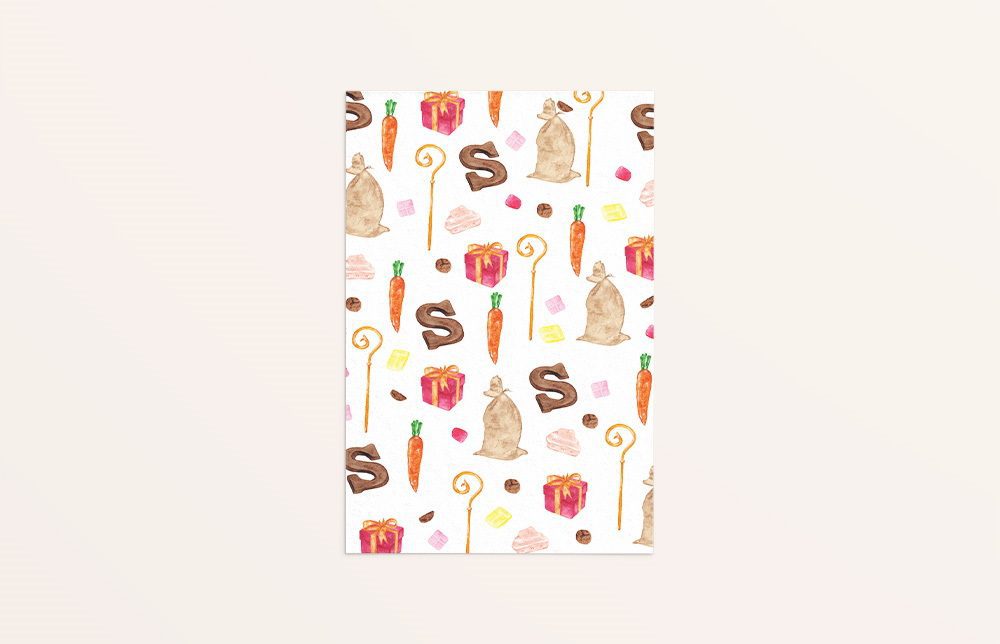 Kaart met vrolijke prints van Sinterklaas items, door Studio Fritsy geschilderd met waterverf. Prachtige handgeschilderde illustratie in aquarel. Deze wenskaart voor de kerstdagen is perfect voor bij een cadeautje of om te versturen. De kaart is gedrukt op mooi stevig papier, dus je kan het ook neerzetten ter decoratie of in een lijstje aan de muur. Zo maak je de Sinterklaastijd nog leuker!
