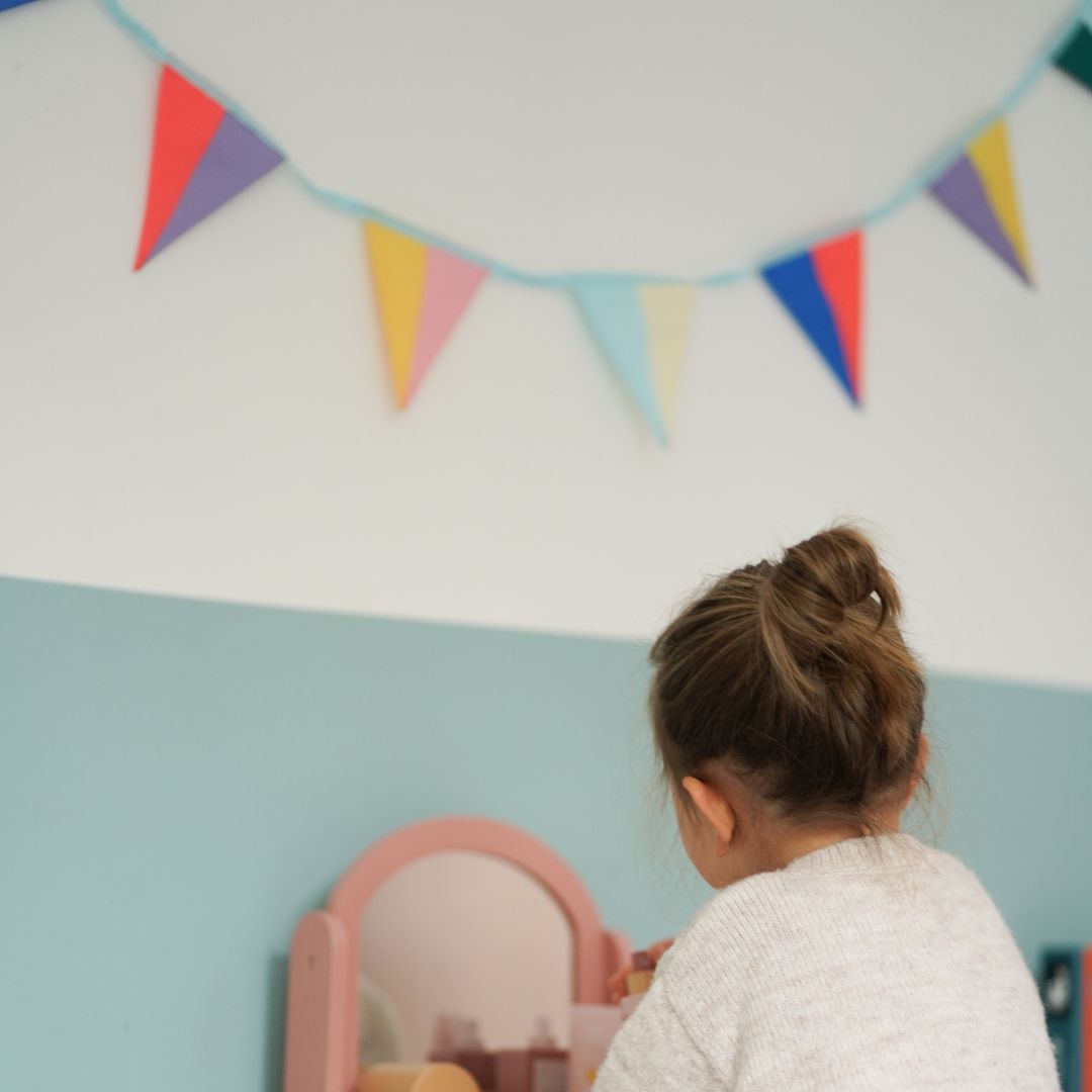 Mini slinger met vlaggetjes voor binnen en buiten. Leuk voor kinderkamer of speelhoek. Lengte 3,65 m en 16 kleine vlaggetjes. Gemaakt van gerecyclede plastic flessen, dus duurzaam
