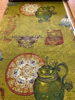 Mooie vintage stof met prachtig patroon. Een mooie theepot, lamp en nog veel meer op je stof, dat is toch geweldig. Deze soepele stof heeft de prachtige jaren '70 kleuren, antieke kleuren met een groot patroon. De ondergrond van de stof is antiek groen en de stof is redelijk stevig. De stof is 120cm breed en natuurlijk origineel uit de jaren '70. Leuk voor bijvoorbeeld gordijnen, kussens, lampenkamp etc. Voel je weer Back to the Seventies!