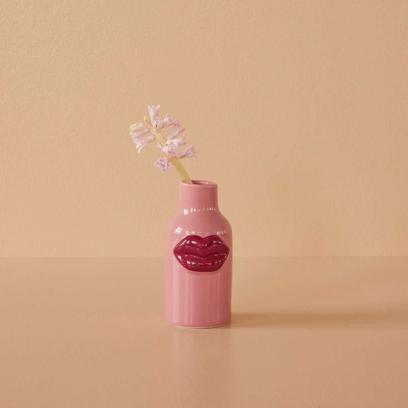 Klein vaasje met “Lips” in de kleur roze met felrode lippen. Leuk met of zonder bloemen. Hoogte 14,5 cm en is van keramiek. Vier de liefde!
