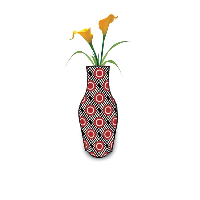 Katoenen stoffen hoes om als bloemenvaas te gebruiken door een kleine plastic of glazen fles te recyclen. Mooie print met rood, zwart en wit.