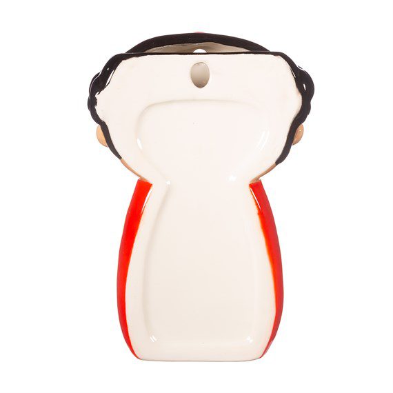 Vrolijke vaas Frida Kahlo om aan de muur te hangen. Vlakke achterkant. Ook om neer te zetten. Verpakt in een mooi doosje, keramiek en handbeschilderd.