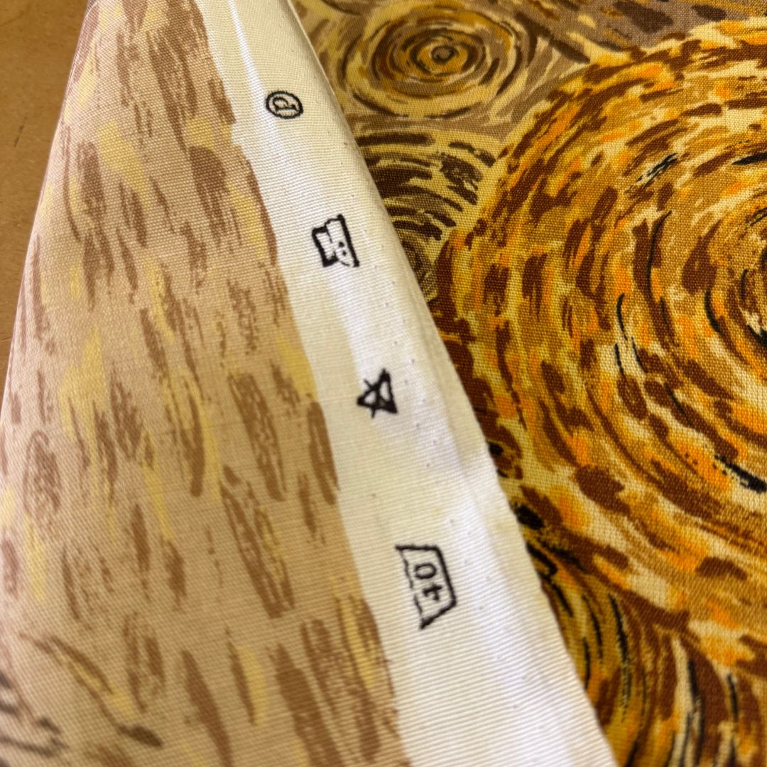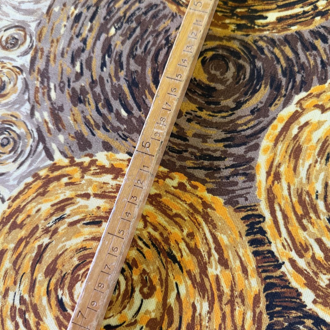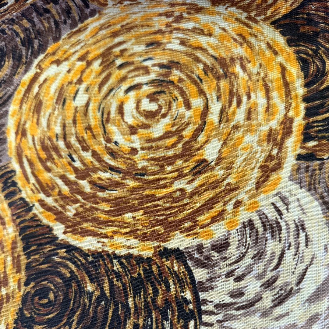 De naam Vincent stond al op de originele verpakking van deze stof. Dat voelt eigenlijk verrassend passend, want het draaiende patroon en de warme kleuren roepen een beetje dezelfde energie op als het dynamische penseelwerk van Vincent van Gogh.