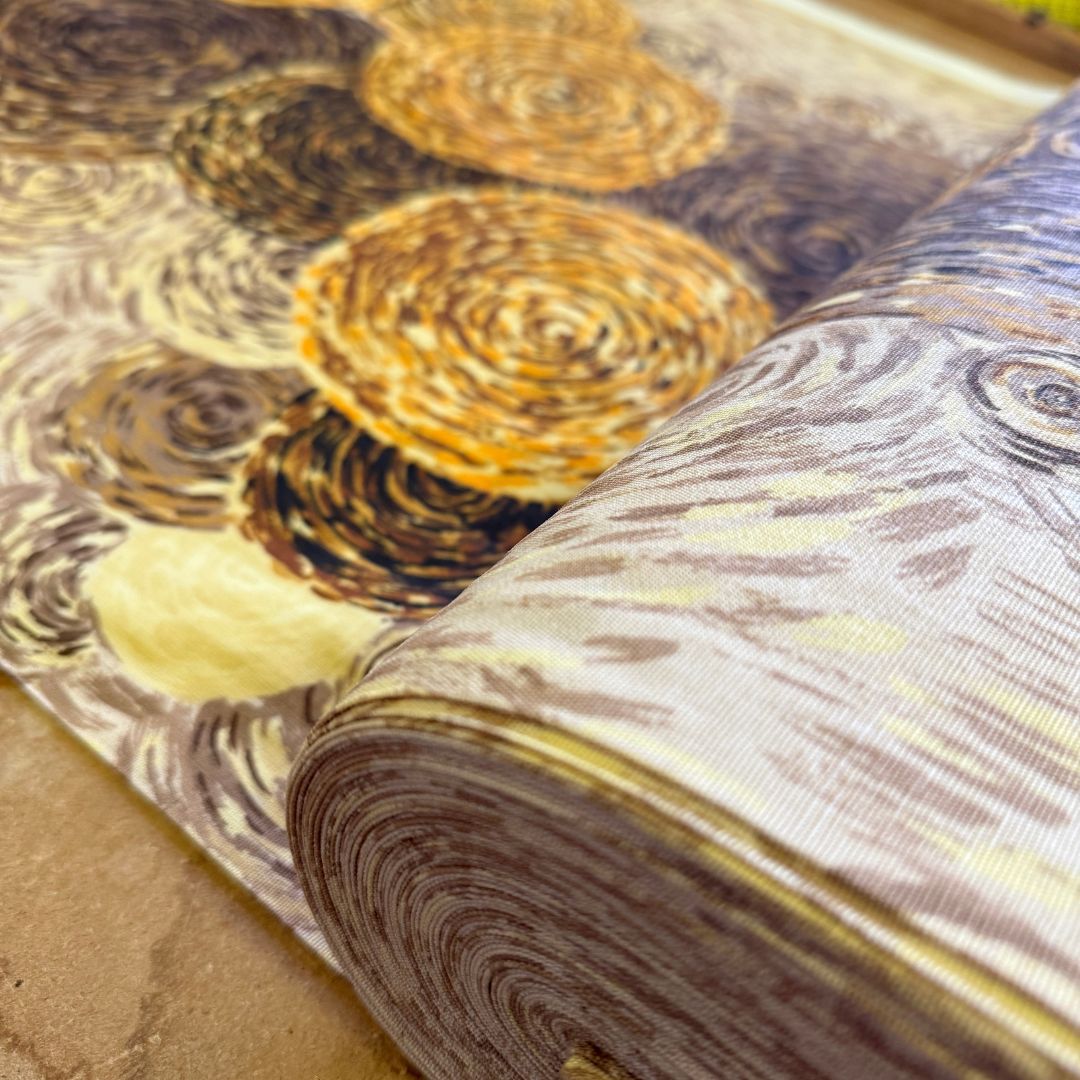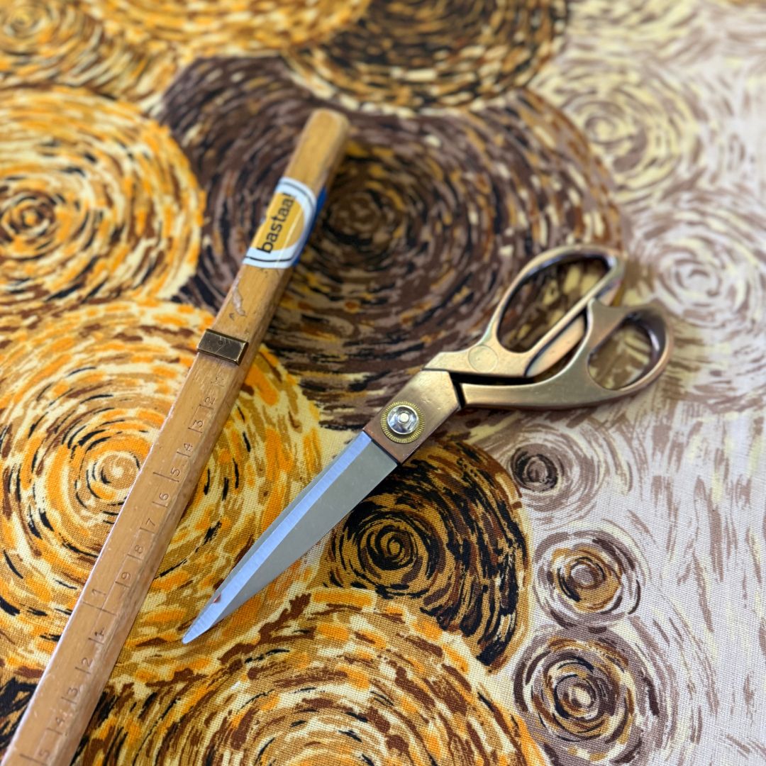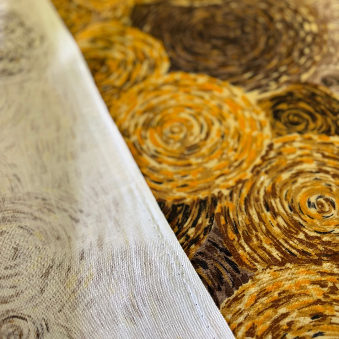 De naam Vincent stond al op de originele verpakking van deze stof. Dat voelt eigenlijk verrassend passend, want het draaiende patroon en de warme kleuren roepen een beetje dezelfde energie op als het dynamische penseelwerk van Vincent van Gogh.