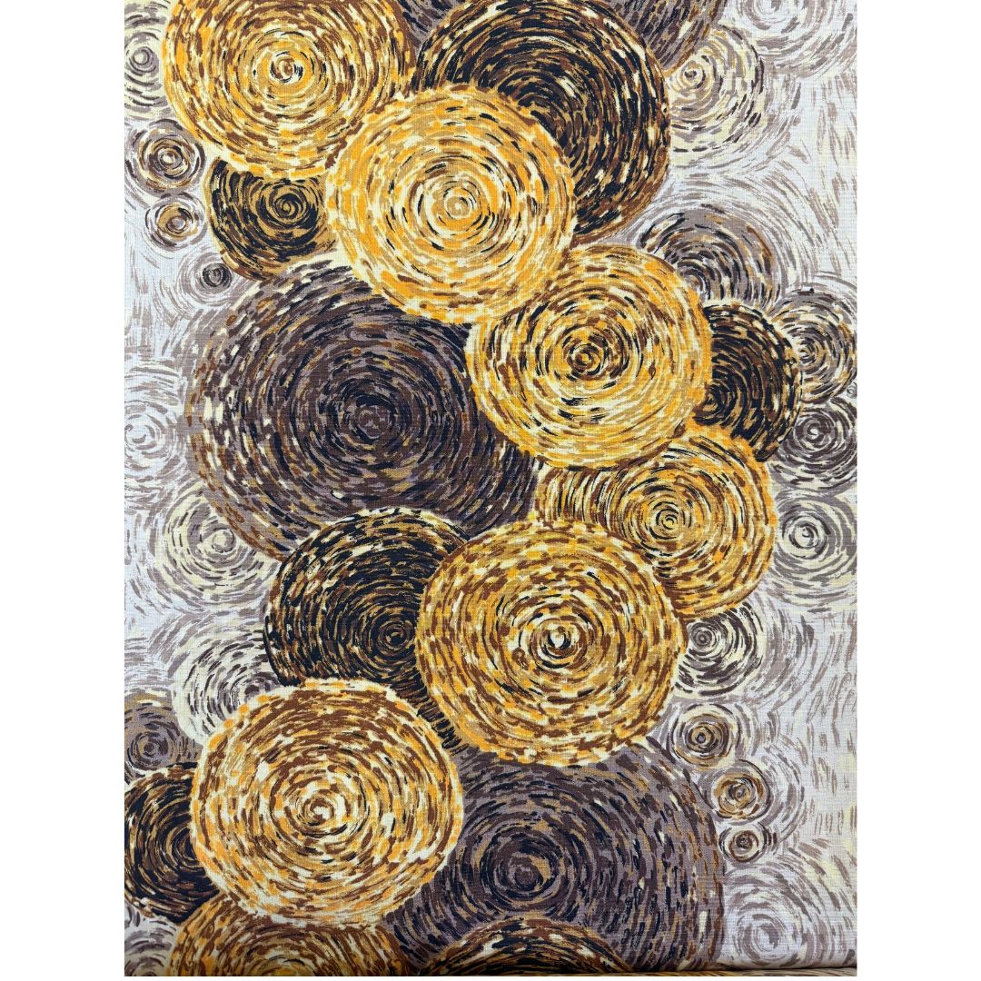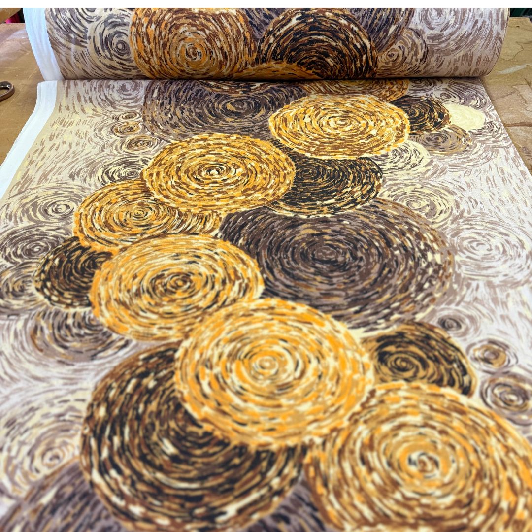 Vincent is een bijzondere vintage stof uit de jaren zeventig met een grafisch patroon van grote cirkelvormen. De warme kleurencombinatie van geel, oker, bruin en crĆØme geeft de stof een unieke retro uitstraling die perfect past bij seventies interieurs.