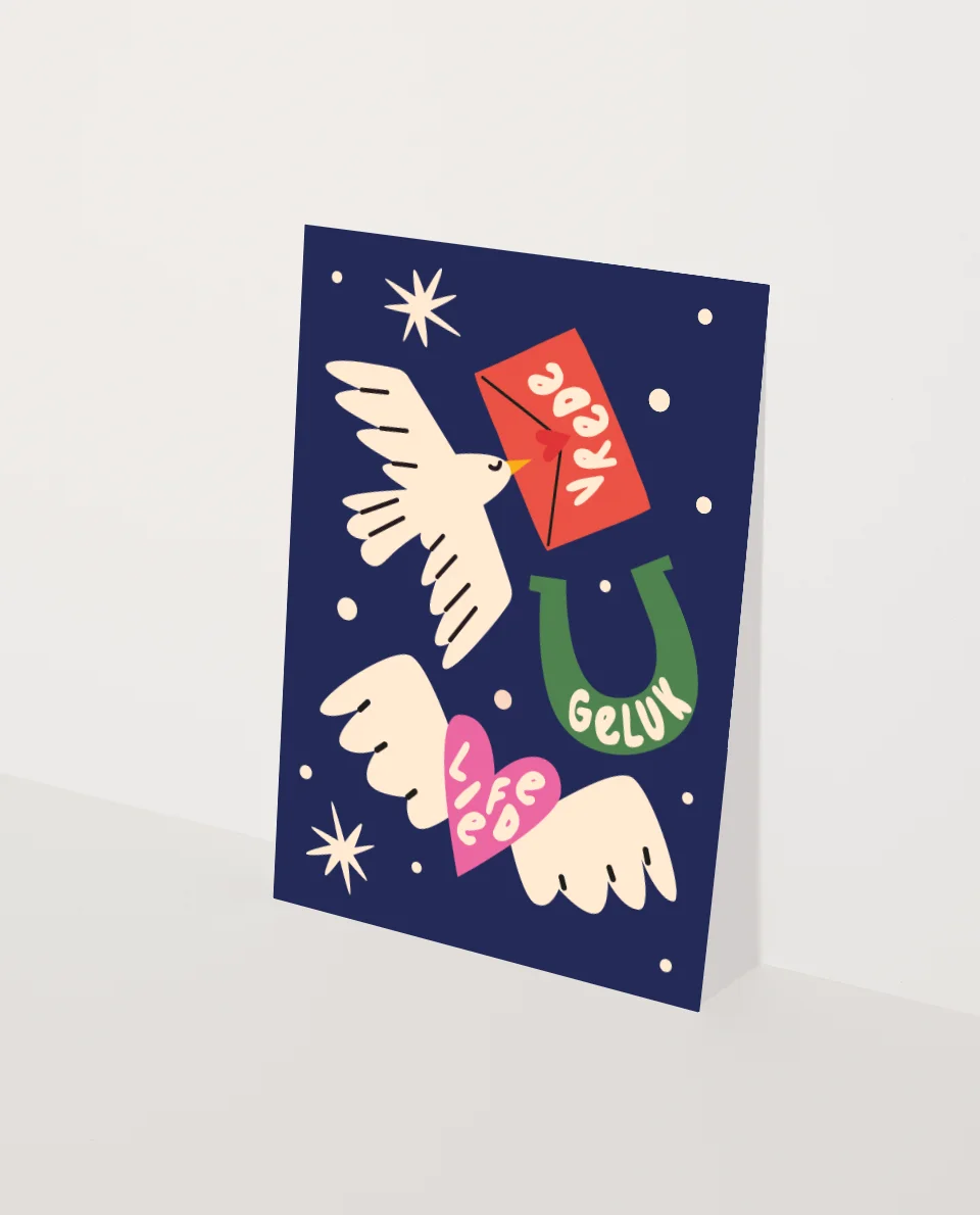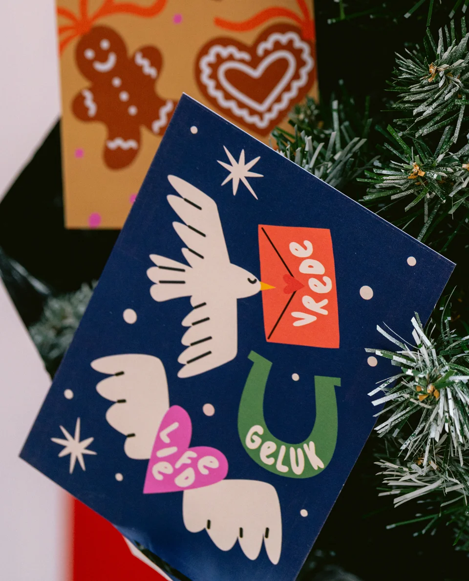 Vrede, geluk en liefde. Simpel gezegd, maar precies wat we allemaal kunnen gebruiken. Stuur de mooiste wensen naar de liefste mensen voor kerst, het nieuwe jaar of een ander liefdevol moment. Deze originele Heyday kaart is perfect voor iedereen die wat extra warmte verdient, met of zonder reden.